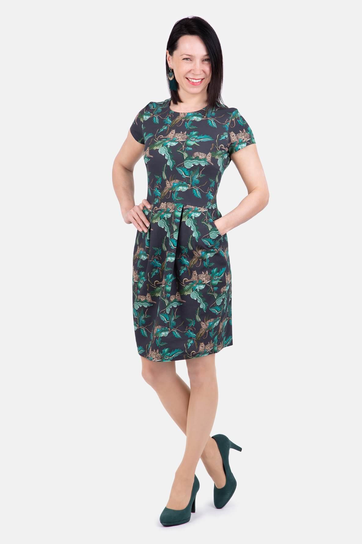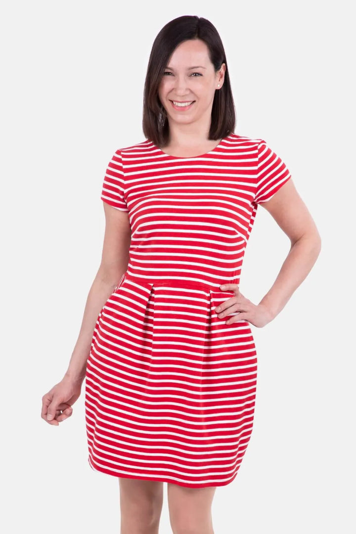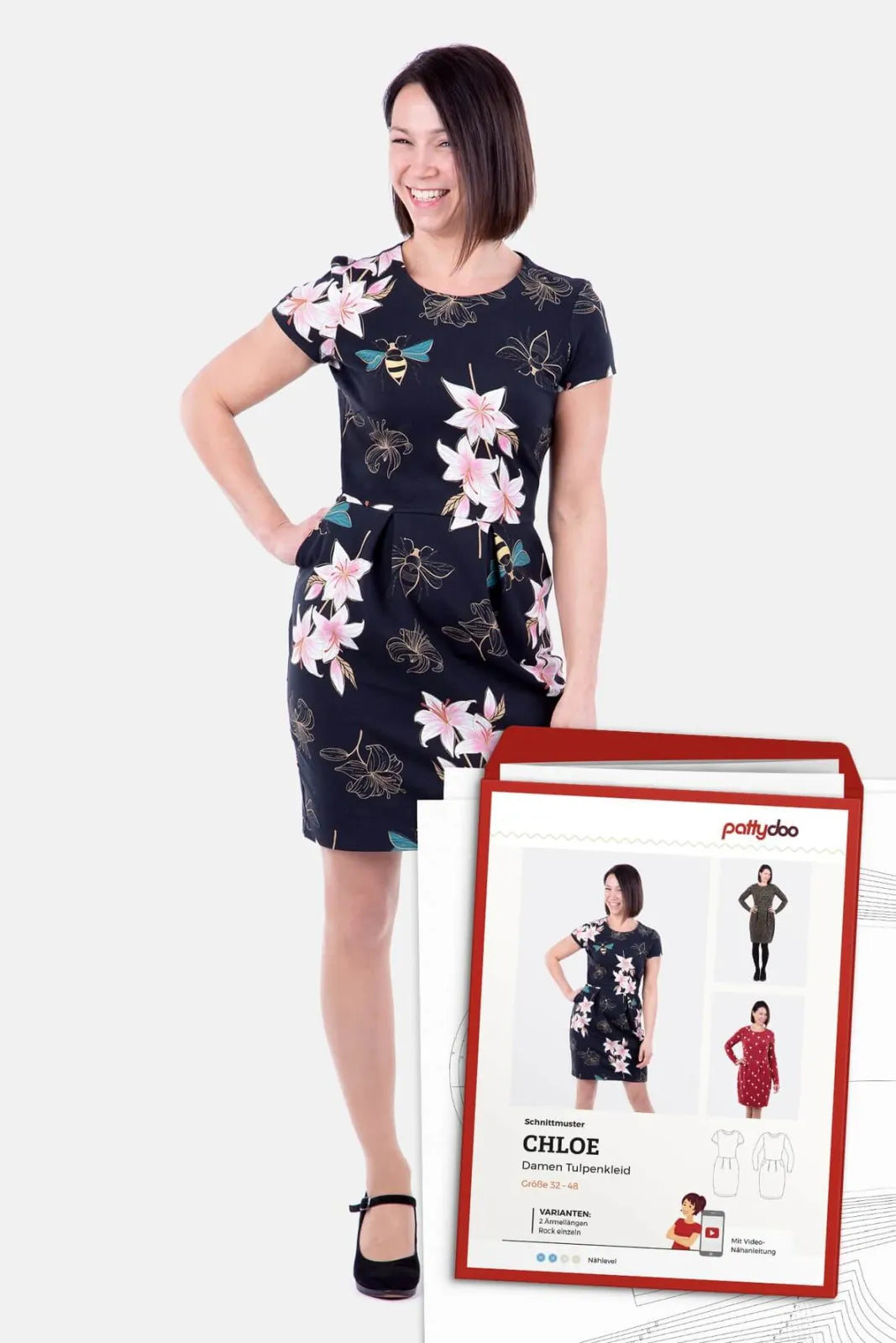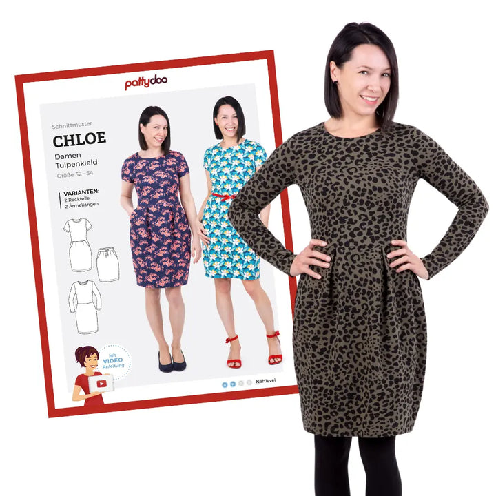 Näh dir mit dem Papierschnittmuster “Chloe” ein verspieltes Sweatkleid mit Tulpenrock. Je nach Stoffwahl kannst du dir eine elegante Variante für den Abend oder ein hübsches Kleid für den Alltag nähen. Das Tulpenkleid wird mit praktischen Eingriffstaschen genäht, die in Kombination mit den Kellerfalten die typische Form unterstreichen. Für eine bessere Passform wird das Kleid mit Brustabnähern genäht. Den Rock kannst du dir auch einzeln mit einem Gummibund nähen. Für das Kleid hast du außerdem die Wahl zwischen kurzen oder langen Ärmeln und unterschiedlichen Halsausschnitt-Varianten.